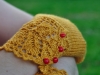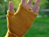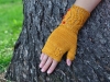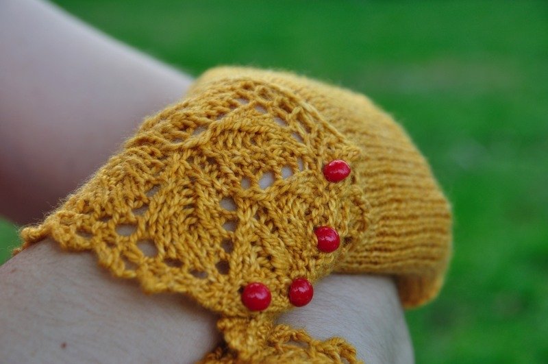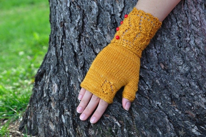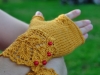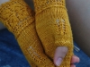 Comme j’aime les mitaines qui couvrent une partie des doigts, j’ai rallongé le pouce de quelques rangs ainsi que la main en décalant le motif en dentelle.