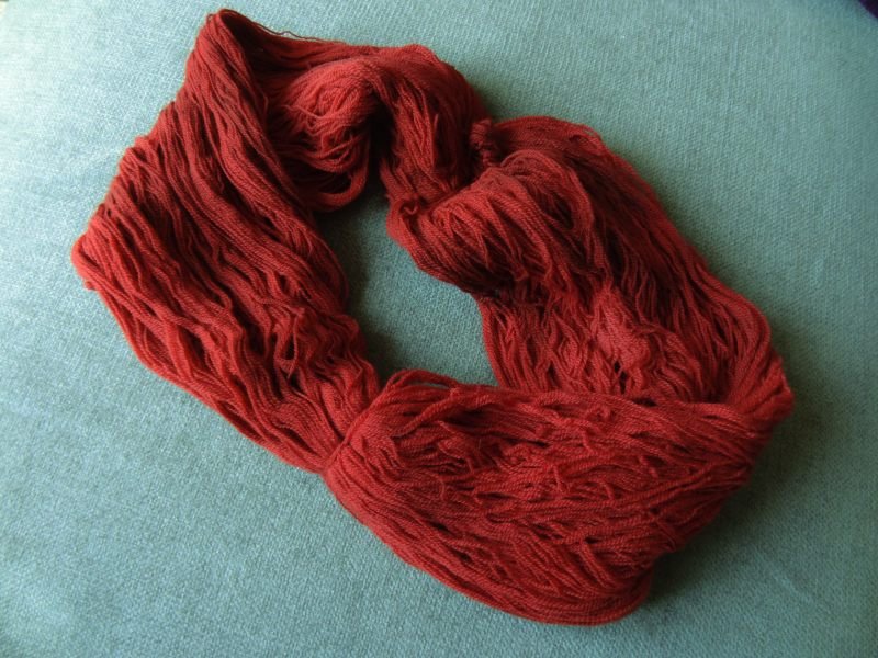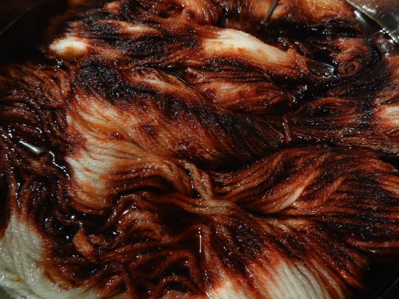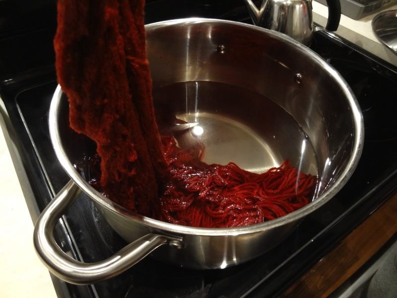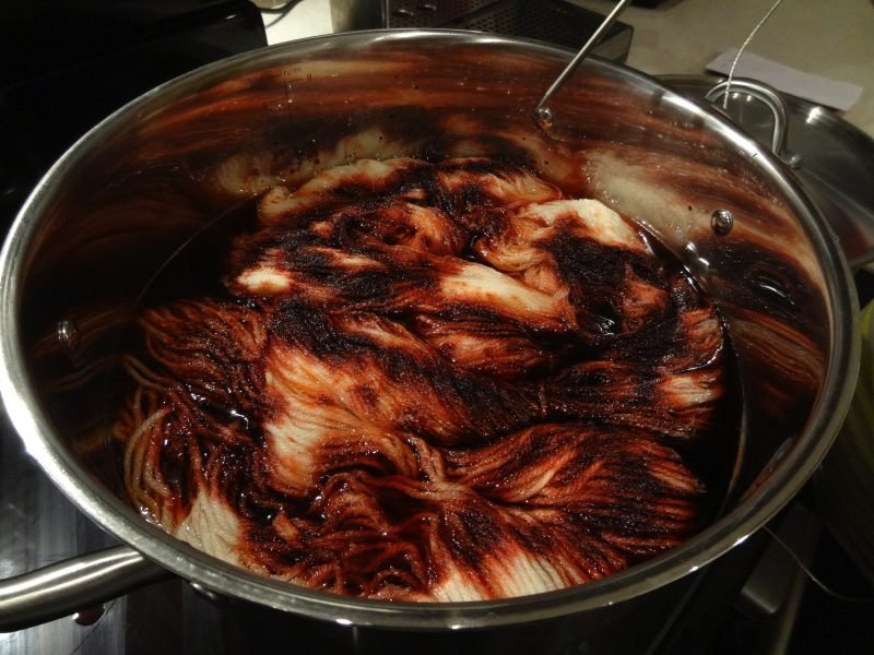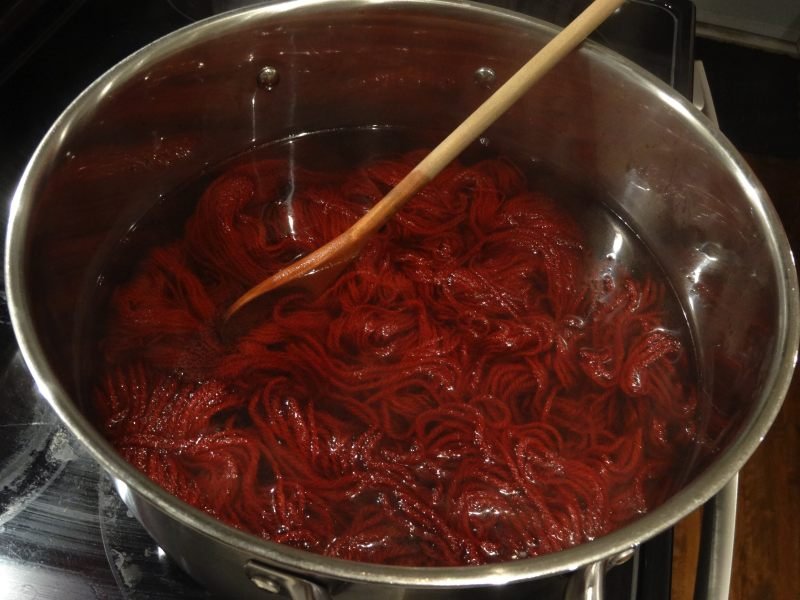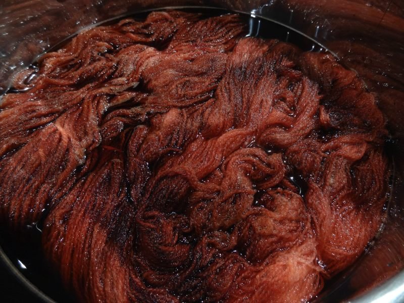 On a augmenté la température petit à petit jusqu’à à 210°F et ajouté une autre petite cuillère car il restait de la teinture dans l’eau. Arrivée à 210°F, on a retiré du feu et on a attendu jusqu’à ce que l’eau soit devenue transparente puis nous avons retiré les écheveaux pour les faire sécher.